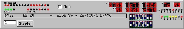 Just underneath the address LED's on the left are the disk drive activity indicators. They act almost like real ones, the primary difference being they'll continue indicating access for a moment even when another drive is accessed. The disk indicators are red when the drive is being accessed, otherwise green when a "disk is in the drive" but unchanged, yellow if a disk is in the drive and has been changed, and dark if no disk is present.