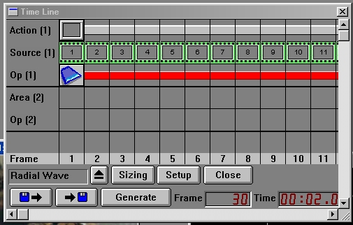 ...these changes will result in a wave which starts at the center of the area selection, and then radiates outward over the remaining ten frames. Click on the Timeline dialog to confirm these settings. WinImages F/x will automatically place the new values into the key frame.