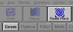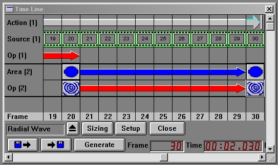 ...once the dialog is open we will want to set the parameters to the following values: Distortion:25, Frequency:5, Half Waves:1, Radius:0, Phase:0, Shading:20. Once you have adjusted the parameters to these settings, you will be ready to place the first radial wave icon in the Timeline. (Before you try to place the radial wave operation into the Timeline, make sure that frame 20 is are visible.) Now, use the drag and drop method to place an icon in frame 20. If frame 30 is also visible, place another radial wave icon there. If it is not visible, scoll the Timeline until it is visible, and then place the 2nd radial wave icon in frame 30.