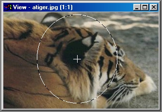 This allows you to make an area selection on the current action image. If the current action image is not the tiger.jpg image, select the area on the image that is presented. WinImages F/x will automatically size the area selection to the action image in the sequence. The elliptical area should be near the center of the image, and should be fairly small, as shown here...