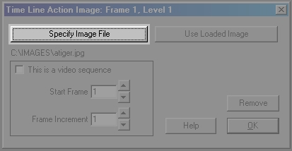 The second image option is the Specify Action Image button. Selecting this button will access the Timeline Action Image dialog. This dialog allows you to specify action image sequences or image files. Select the Specify Image File button located at the top of the dialog. This will open a file requester for selecting the image or image sequence to load. Select the atiger.jpg image from the...