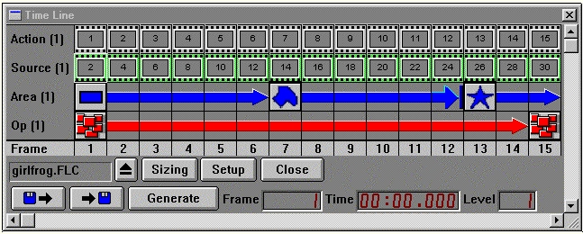 WinImages F/x uses three separate frame classifications for a Timeline frame. These classifications are Key Frame, Continuance Frame, and Empty Frame. A Key Frame specifies the beginning of an operation, area selection, or image file. A Continuance Frame is any frame that contains a portion of a key frame interpolation arrow. These frames specify the continuance or interpolation of an operation, area selection, or image file. The Empty Frame is the final frame type. An empty frame is any frame that is not a key frame or continuance frame. The rest of the controls and icons are explained in the detailed documentation below.