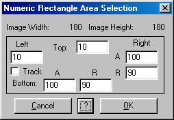 The Numeric Rectangle area selection dialog will appear when you click within a view when this tool is selected in the area toolbox. The dialog allows you to set the Left, Right, Top, and Bottom dimensions of the rectangle. All values are in pixels, and are measured from the top left corner of the view.