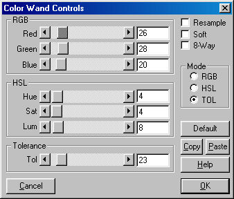The variance values can be specified for RGB, HSL or Radial Tolerance by right clicking on the Color Wand icon in the tool box, or by selecting the Color Wand Controls... Command from the Area menu. This will present you a set of RGB, HSL and Radial variance sliders. Once you have selected the desired color space and the associated variance(s), select the Ok button to close the dialog. The fill region will then be selected based on the Hue or RGB values of the selected color, the specified variance values, and the three wand options, which are detailed next.