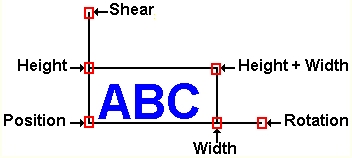 The font style dialog can also be accessed by right clicking on the Font area selection mode icon in the tool box. The Font is placed in the image by clicking the image with the left mouse button. This will bring up the font area selection control. The control allows you to set the horizontal and vertical size, rotation, and shear amounts. Each of these controls can be manipulated by simply clicking on the control with the right mouse button, and then dragging the control to the desired position. The diagram below shows the position and function of all of the font controls.