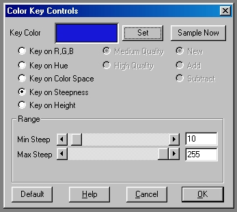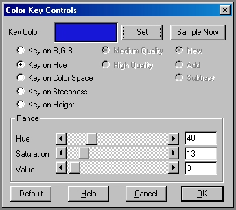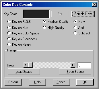 Medium/High Quality: This control alters the quality of the color key space. A medium quality space will produce fairly good results with low memory usage, and a high quality space will produce excellent results with higher memory requirements. Remember, it is possible to alter from one quality of key space to the other, but their will be some minor reduction in quality the more times you switch quality to quality. These options are only available of the Key on Color Space option is selected.