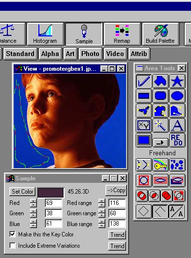 The Color Sample dialog will then adjust its RGB and variance sliders to match the sampled color. In some cases you will be keying on a specific color in the area selection. In these cases you can access the Color Key Control dialog from the Area menu or by right clicking over the Color Key icon. This dialog allows you to specify a color and a specific variance for the key color.