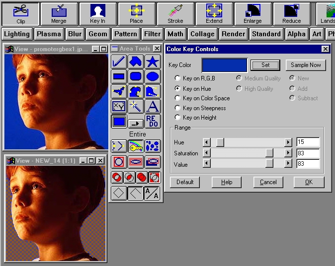 This area selection mode can be used in conjunction with the Union modifier to create multiple color keyed area selections. For example, you would like to create a mask that contains all of the Blue and Magenta in the image. This is done by first keying on the blue using the Entire area selection mode and the Color Key modifier set to a key color of Cyan. Next, you would need to select the Union modifier, and reset the Key Color controls to the desired Magenta color. The area select will be completed when you click on the image. The mask that is created will contain all of the Blue and Magenta from every portion of the image. Creating masks based on a single or multiple colors is sometimes called Blue Screening instead of Color Keying. This comes from the use of "Blue Screens" as color keys in video for creating effects like a space craft moving through a star field or the projection of weather maps for the evening news.