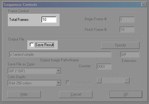 The Sequence Controls dialog allows you to set the length of the animation/filmstrip as well as other items we'll get to later. Set the Total Frames control to 10 by entering the number in the provided text entry field. This sets the length of the animation (and the filmstrip) to 10 frames. For this tutorial we will want to turn the Save Result control off...