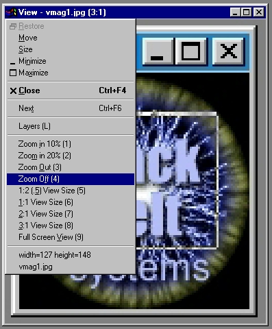 To begin, load any image using Load Image and it's MRU (Most Recently Used) subdirectories in the File menu. The image then appears in a view window. If the image is of a size that will fit in the working area, the image will be shown at a 1:1 display size. If it is larger than the working area, WinImages F/x may reduce the view size so that the entire image is visible. You can work on the image in this form, thoughy care shold be exercised due to the fact that area selections aren't as precise as they could be. This is because not all image pixels are visible and selections no longer overlay the image on a pixel for pixel basis.