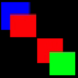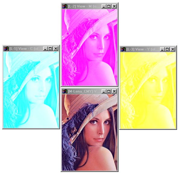 The separated image created by the first three selections is constructed using layer modes to recombine these separated channels into a full-color image.