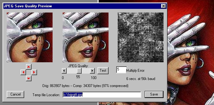 You can pan around the image by dragging the images with the left mouse button, and there are some useful cue displays such as download time and file size available with each test image you generate. In order to create the test images, FX actually creates an actual JPEG file; you can change where it does this. The test file is deleted when you exit the preview window.
