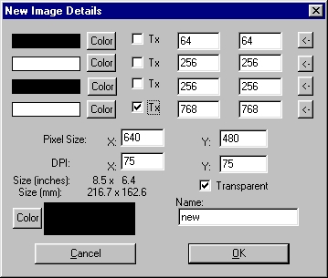 The Name field allows you to specify a name for the new image. The name of the new image will be provided by the program if you do not specify one. The Pixel Size setting allows you to specify the size of the new image in pixels. This setting will default to the last values that were entered. The DPI setting allows you to alter the Dots per Inch of the new image. You will notice that as the Pixel Size and the DPI are altered, the size in inches and millimeters will change to reflect the new size of the image. The Specify Initial Color allows you to select the color of the new image. The control, when pressed, will provide you with a palette of colors to choose as the new image color. The color will default to the last selected color. If you select the Transparent option, the image will be created with an active, completely transparent alpha channel.