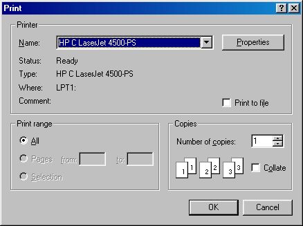 When you select this menu item, the system printer dialog will open. Select the printer you wish to use. The dialog may appear slightly different to you, depending on the type of printer you have.