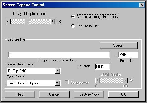 Counter: The counter will put an automatic four digit extension on to the current capture file name. This allows you to capture a number of sequential screens that have an identifying number. This number is automatically incremented whenever a new screen is captured. This counter can only be reset by entering a zero value.