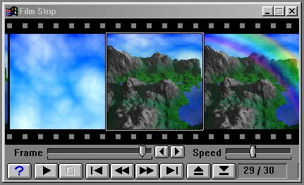 The Filmstrip in WinImages F/x allows you to view animations that you have created or simply keep a visual record of the changes made to an image. The filmstrip controls are simple, and are similar to the controls of a VCR. You can play, stop, rewind, fast forward, and eject the filmstrip using the filmstrip controls. There is also a control to alter the playback speed of the animation. The length, resolution, loading, saving, method of play back (Pong/Normal and Reverse), and frame rate settings for the filmstrip can be set using the Time Line and Filmstrip pull down menus.