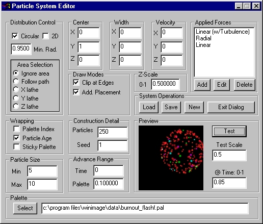 | This system is 250 particles. The general idea is to have them all bunched up initially (inside the imaginary fireworks rocket), "launch" them that way, with color set to white so they look like a hot rocket exhaust, then "blow up" the firework when it reaches altitude. The Y center of 1 initially displaces the particle system to the bottom of the image. The system is a 3D system with a minimum radius enforced, so that particles are distributed in a shell rather than a solid sphere. The palette advance allows particles to vary in color no more than 10% of the current position in the palette. Clip at edges is set so that particle that go off the edges stay gone (don't wrap) and Additive Placement is selected so that particles that are superimposed will be twice as bright, just as they would be in a real explosion. The initial width of the system is 0, 0, 0 so the particles are all bunched together. |