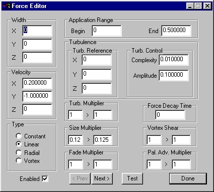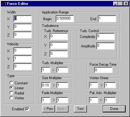 This is the "launch" force. It causes the particles to accellerate from the ground for time 0 to time .5. A small amount of turbulence is applied, as these rockets don't generally have good enough propulsion and guidance systems to fly up in a perfectly straight path. This force also factors the particle size by .125 to make them 1/8th what the main dialog indicates. Since the main dialog specifies from 5 to 10, this means that this force holds them to a minimum of .625 and a maximum of 1.25, or just slightly larger than one pixel. Small!
