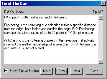 This allows you to bring up the tip of the day dialog manually. The Tip of The Day dialog will come up automatically when the program starts, unless you have used the File / Preferences command to disable this.