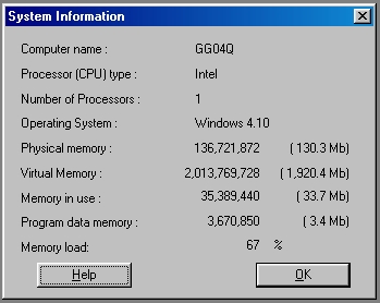 This panel contains information about your system and current memory usage. The system info includes your CPU type, Math Co-processor, Windows mode information, and the number of processors. The memory information tells you the amount of total memory, free memory, and the largest free block of memory.