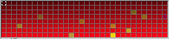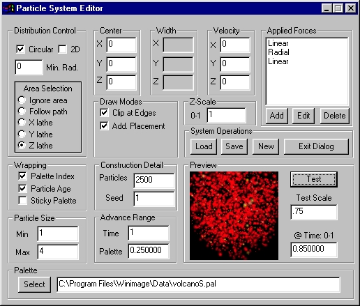 | 2500 particles, lathed by an area selection. Particles vary from 1 to 4 pixel radii, and exist all over the system lifetime (via the 1.0 advance.) They advance 25% into the palette colors, and the palette color index wraps as well. |
