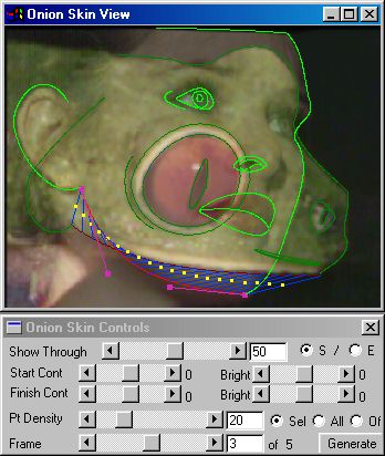 After an object has been specified for both the start and end images, lines of correspondence will appear from the start image object to the end image object. At this point you can increase or decrease the number of points, or leave the object as they are. You can also use the onion skin window for editing existing objects and point sets by using the standard editing tool, and the provided S (start) and E (end) image toggles. Pressing the S or E buttons will cause the start or end image to be currently "on top" of the other image.
