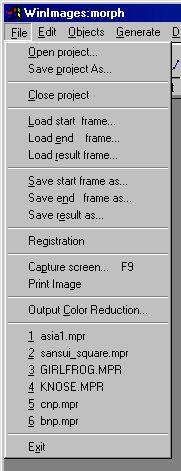 This will close the current project and clear the start, end, and result images. If a filmstrip has been created or loaded it will also be cleared. All morph controls are also deleted. If a current project has been set up, the program will ask whether the project should be saved. The film strip is not saved with the project, but must be saved separately if desired. If the controls have changed, the program will save them before saving the project file. The project file contains the name of the controls file and the controls file contains any changed velocity and transparency curves.