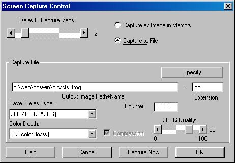 The screen capture option allows you to set up a screen capture from within morph. The screen capture utilities can be used to capture morph's screen immediately, or it can be delayed so that you may capture the screen of another application. You also have the option of capturing into memory (an image view in morph), or capturing into an image file. Once a screen has been captured, it can be treated like any other image in morph. Step by Step Instructions for Capturing Screens: