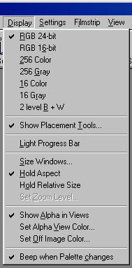 Although 16 color displays use a palette, the palette has to be preset for use by Windows. The program uses dither to it fullest, however a 16 color display can only achieve about 60% color accuracy. It certainly works, but we would encourage anyone who works with full color images to get a display with more color capability. There may be a compensating factor, however, if you have a very high resolution display, the number of pixels can make up for low color accuracy, similar to the way that magazine pictures get away with only four (or actually five) colors.