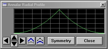 The close button will close the radial profile. The newly created profile will then be used in the next annular operation, unless one of the preset annular operations is selected first. Selecting one of the presets will alter the profile to fit the preset's specifications. This dialog can also be closed by double clicking on the System Menu box or by pressing Alt F4.