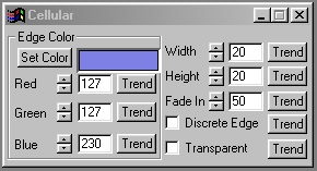 The Fade In control allows you to specify the amount of the cell's edge color that is visible. This control can be thought of as the amount of blending of the edge color and the cell color. Increasing this control will cause there to be no blending, and decreasing the Fade In value will result in a more blended edge. The setting is a percentage value that ranges from 0% to 100%. A setting of 0% will result in cells that have no edge color, and a setting of 100% will result in a cell that has the maximum amount of edge color. The Fade In value can be set using the slide gadget or by entering an appropriate value in the text entry field.