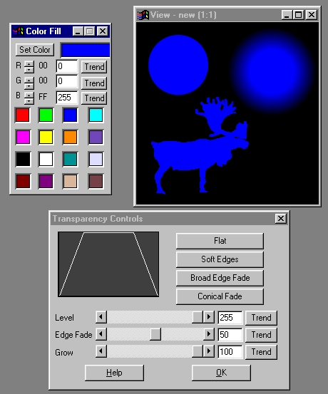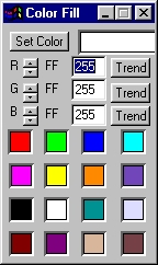 The Color Fill operation will fill the selected area with the specified color. The color is altered by moving the Red, Green, and Blue sliders, or by entering the appropriate values in the provided text entry fields. As the sliders are moved you will be able to view the changes to the color in the sample color preview window. After you have the desired color, you can then fill areas in the current view.