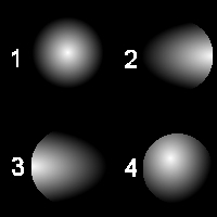 The Y Bias control is used to set the center location for the concentric fill. This location sets the initial position for the last color in the palette. From this position all other colors in the palette will radiate outward in concentric rings. The control ranges from -100 to 100. This value is measured as a percentage of the area select from the center towards the left or right edge. All negative values will move the center down, and all positive settings will move the center up. It is important to remember that shifting the Cycle control will alter the sequence of the palette, thus placing another color in the center. The example shows four separate Y Bias settings. Number 1 shows a Cycle of 0, and a Y and X Bias of zero. Number 2 shows a Cycle of 0, an X Bias of 0, and a Y Bias of 100. Number 3 shows a Cycle of 0, an X Bias of 0, and a Y Bias of - 100. The final example, number 4, shows a Cycle of 0, a Y Bias of 30, and an X Bias of -20. The animation example above uses a shifted Y and X Bias in the Concentric Fill letters to create an off-center color cycling effect.