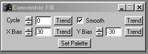 The Concentric Fill operation allows you to fill a region with the current palette in a circular manner. The colors in the palette will fill the object in concentric rings of color starting with color zero at the edge of the area, and radiating inward to the final color in the palette. You can control where the center of the object is located, and the Cycle or position of color zero. This tool is useful for creating cycled colored ranges in text and other objects.