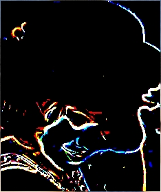 If you turn the Threshold checkmark on, then when the result of the convolution is greater than the threshold, the output is fully on; otherwise, it is fully off. Try the Sobel example, below, both with and without the threshold checked. The difference is quite striking.