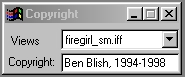 The dialog consists of two controls - Views and Copyright. The Views drop down box allows you to select which image view you would like to alter the copyright information for. The Copyright text entry field allows you to enter the appropriate copyright information for your images. It is important to remember that this information can only be saved in the TIFF and IFF file formats. Using other save formats for images altered by this operation will result in the loss of the copyright information. This operation does not require an area selection.