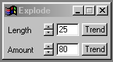 The Length control allows you to set the length of the explode operation. The length can range from 0 to 200 pixels. If a negative length is specified the operation will be an Implode instead of an Explode. It is important to remember that increasing the length may also increase the amount of computational time needed to complete the effect. The length can be set using the slide gadget or by entering the appropriate value in the provided text entry region.
