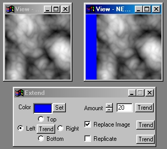 The Extend operation allows you to increase or extend the physical size of the image in any one direction. You have control over the direction of the pixel extension, the number of pixels, and how the new pixels will appear. You also have the option of replacing the previous image, or creating a new image with the specified pixel extension. This operation can be especially useful for creating banner or caption areas in the image for text.