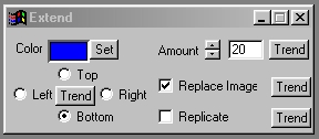 This control allows you to set the total number of pixels that the image is to be extended in any one direction. The control ranges from a setting of 1 to a setting of 9999 additional pixels. It is important to remember that extending an image by a large number of pixels will greatly increase the amount of memory necessary for the image.