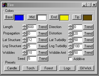 The Lateral Turbidity determines how distorted and separated the flames will appear. The control itself determines if the flame will be treated as a single flame (candle preset) or as a number of flames (forest preset). Turbidity values below 50 will cause the program to treat all of the lateral structures as a single flame. Values of 50 or greater will cause each lateral structure (flame) to be treated individually. This is very important to remember - especially for animations. For example, decreasing the lateral turbidity (below 50) for the forest preset would cause the individual flames to move as a single flame similar to the logs preset.