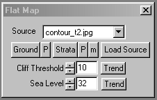 This control allows you to load a 256-color palette to use as an altitude cued color scheme for the output landscape in areas where the land is steeper than provided for in the steepness control if steep is checked. The P control immediately to the right of the Strata control allows you to actively edit this palette at any time. If you would like to learn more about the palette controls, Click Here.