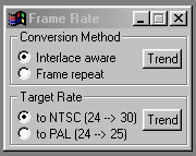 These radio buttons allow you to select the output frame rate that you are using. Selecting NTSC will provide you with 30 frames for every 24 that are processed. The PAL option will provide you with only 25 for every 24 that are processed. The most common usage of this control is NTSC.