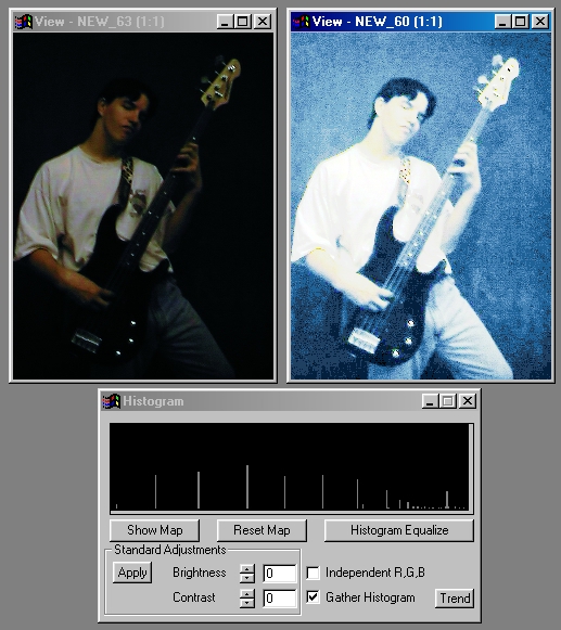 You also have the option of altering only a particular group of brightness values. The group can be windowed by using the Brightness and Contrast controls to enclose the desired brightness values. This group can then be equalized by selecting the Histogram Equalize button, and then pressing the apply button. The next area selection made will then equalize only those brightness values in the selected area.