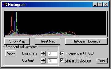 This button, when pressed, will reorganize the image brightness values so that they are statistically evenly distributed through out the available color range. This operation can be done for the whole range of brightness or for a group. A group of brightness values are equalized by windowing the brightness values using the brightness and contrast controls, pressing the Histogram Equalize button, and then pressing the Apply button. Doing this will apply a histogram equalization that occurs over only the selected brightness levels. It is important to remember that histogram equalization will almost always lose some image information, but the overall effect can be quite pleasing.