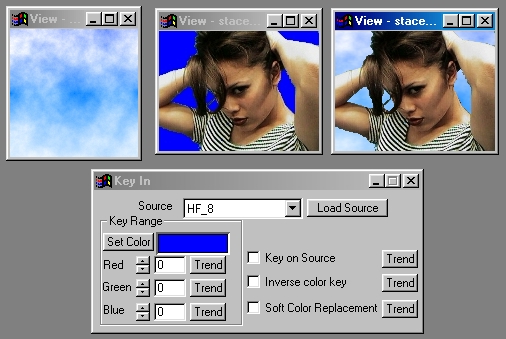 The Key In operation allows you to merge an image based on colors found in the action image. You can select the color to be used for keying, the source image to be merged, the keying method, and the variance in the key color. The merged image can be placed everywhere that the key color exists, or everywhere that the key color does not exist.