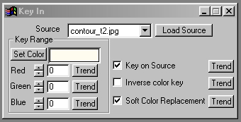 This control allows you to select how the source image will be merged into the specified key color. If this control is selected, then the source will be merged on a percentage basis across the range. This means that colors nearer to the key color will be replaced more than colors far away from the key color. The overall result is a softening of the merge giving it a blended look. If the control is not selected, then every color that is within the key color and its range will be filled with the source image data. This type of key in can be rougher, but is still quite effective.
