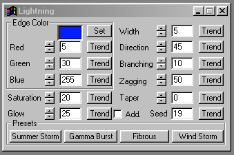 The Lightning operation uses a fractal based mathematics method of electrical simulation to create a random lightning bolt that is repeatable based upon a particular seed value. The seed values can range from 0 to 32,000, and can be used to produce an almost unlimited variety of lightning strikes. It is important to remember that even though the seed value will make the lightning repeatable, altering the branching or zagging controls can completely change the lightning bolt. If you find a lightning setting that is particularly useful to your work, we strongly suggest that you save those settings using the Save Op Settings option in the Operations menu. By doing this you will be able to reload the specific lightning bolt, and use at a latter time.