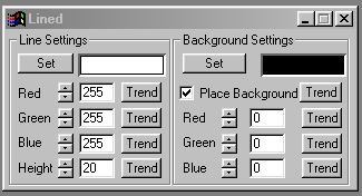 This preview window will display the color of the background color that is to appear between the lines. This color will change as the Red, Green, and Blue values are altered. As the RGB controls are altered the Background color preview will be updated to reflect the changes.