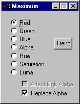 These radio buttons allow you to choose the criteria by which the maximum is determined. Choosing the red, for example, will compare each surrounding pixel by their red value. The surrounding pixel with the highest red value will hold the values for replacement. These pixels can be compared by: