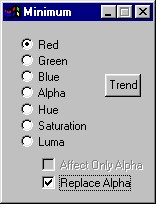 These radio buttons allow you to choose the criteria by which the minimum is determined. Choosing the red, for example, will compare each surrounding pixel by their red value. The surrounding pixel with the lowest red value will hold the values for replacement. These pixels can be compared by: